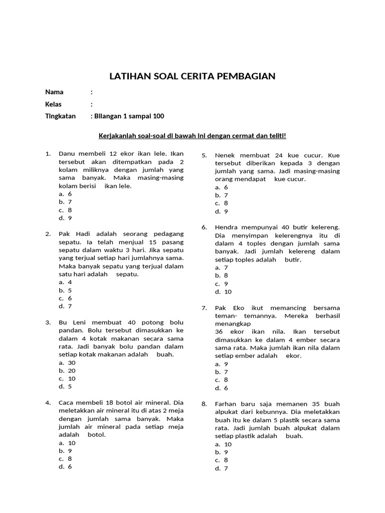 Soal cerita pembagian di kelas 3 SD bukan hanya sekadar latihan angka, melainkan sebuah pintu gerbang untuk memahami bagaimana matematika beroperasi dalam kehidupan nyata. Dengan membekali siswa dengan pemahaman konsep yang kuat, strategi penyelesaian yang efektif, dan lingkungan belajar yang mendukung, kita dapat membantu mereka tidak hanya menguasai pembagian, tetapi juga membangun kepercayaan diri dan kecintaan terhadap matematika. Mari kita jadikan setiap soal cerita sebagai petualangan baru dalam dunia angka yang penuh makna!